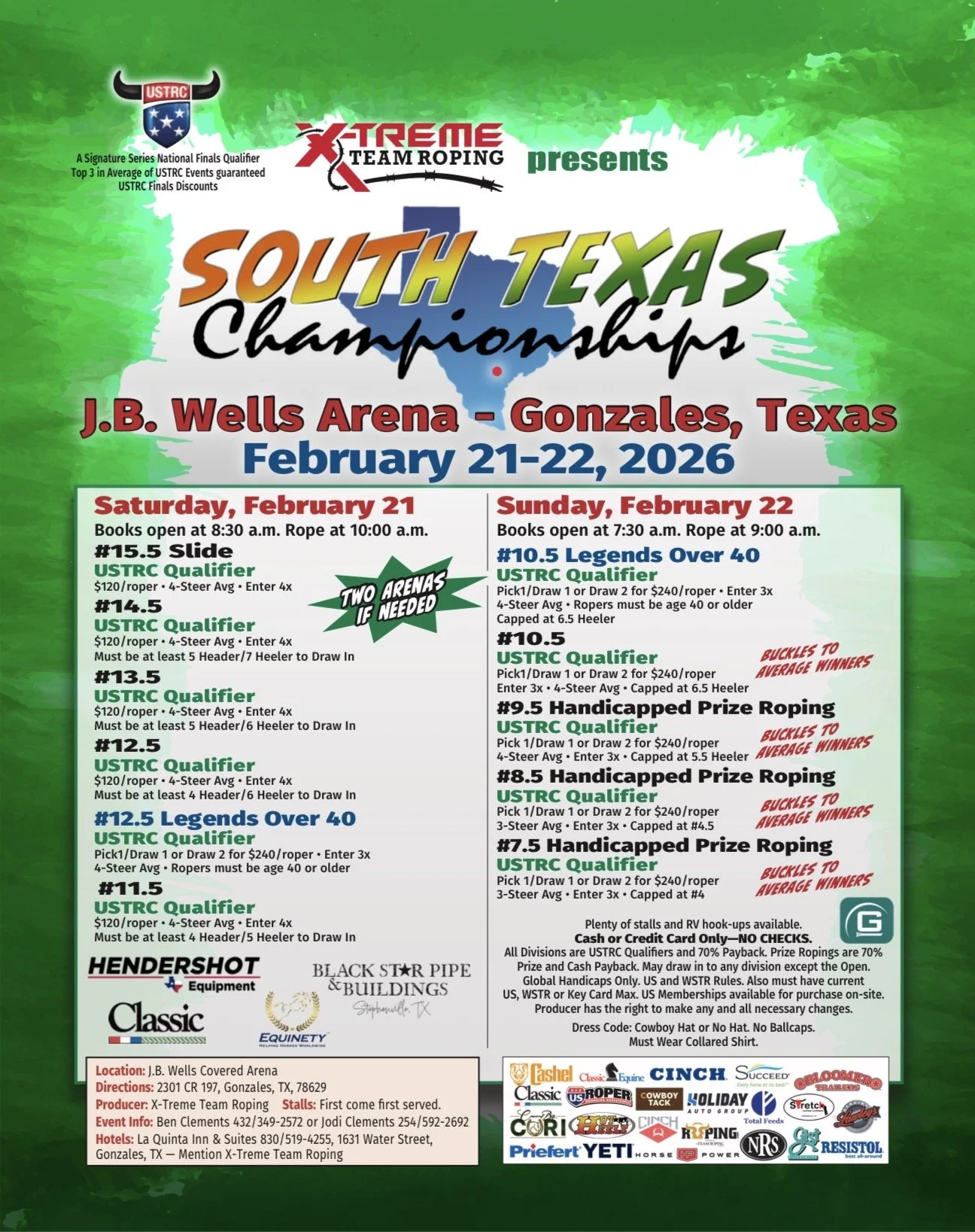 South Texas Championships Saturday, February 21, 2026 10:00 AM 10:00 Sunday, February 22, 2026 8:30 PM 20:30 JB Wells Arena 2301 County Road 197 Gonzales, TX, 78629 United States (map) Google Calendar ICS JB Wells arena | gonzales, TXCash or Credit Card only - NO CHECKS